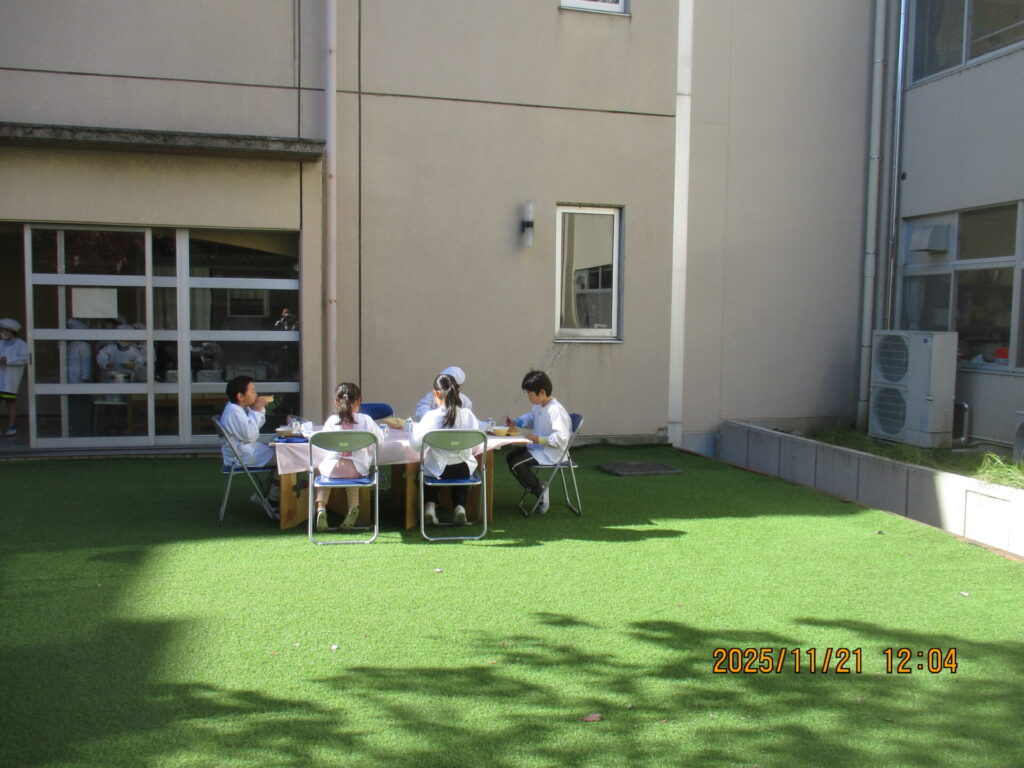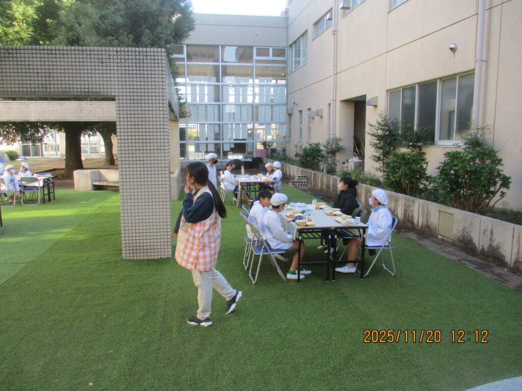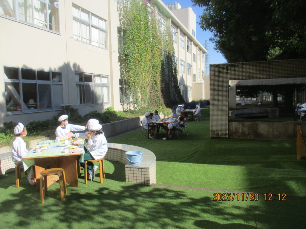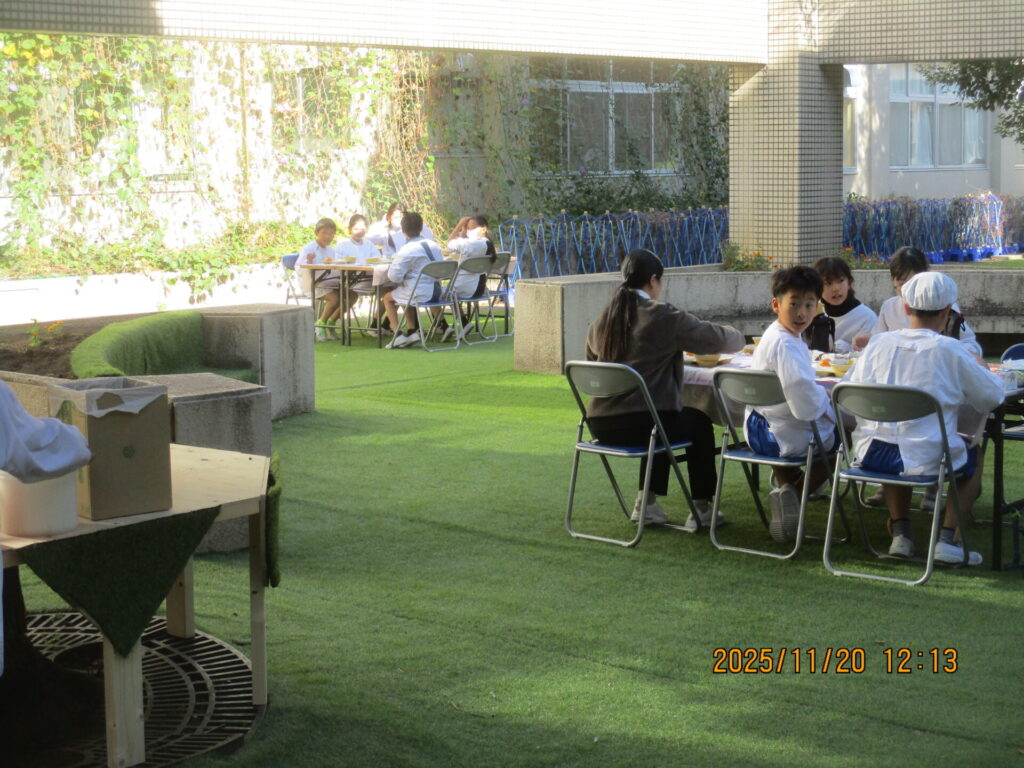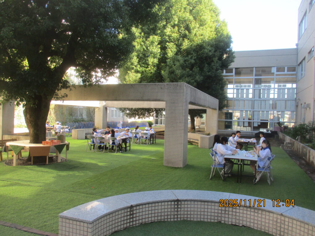 中庭で給食を食べる「わくわくガーデン給食」を実施しました。