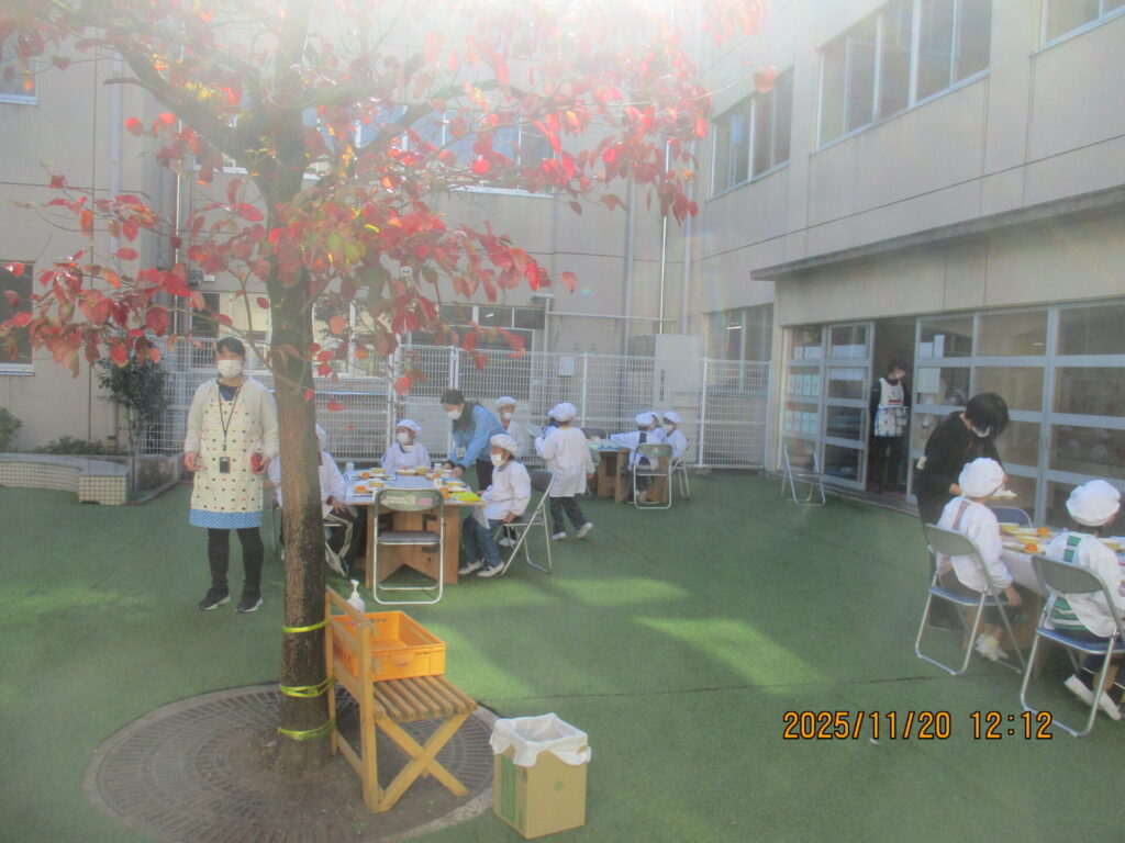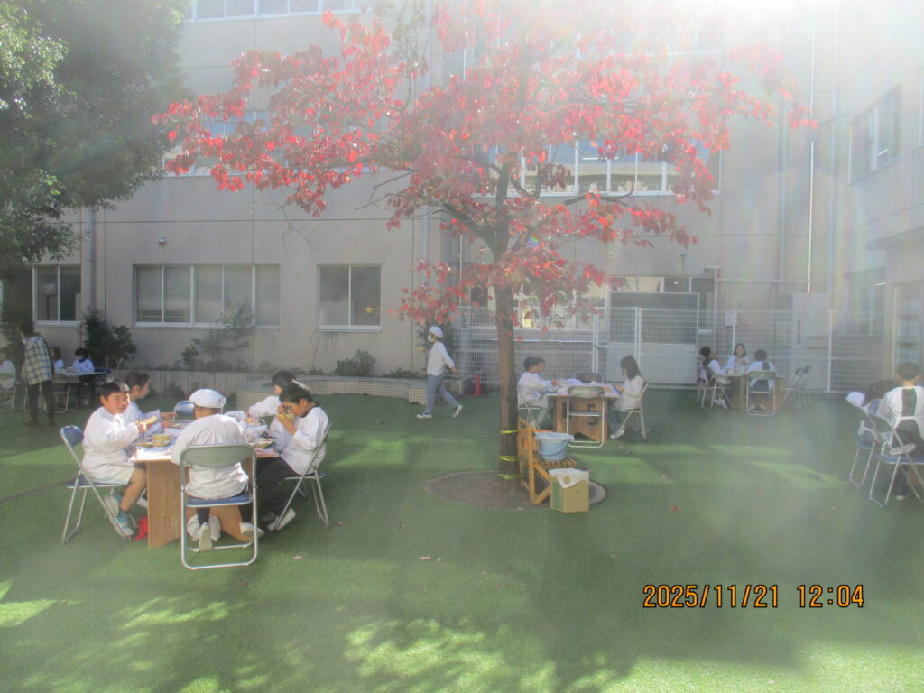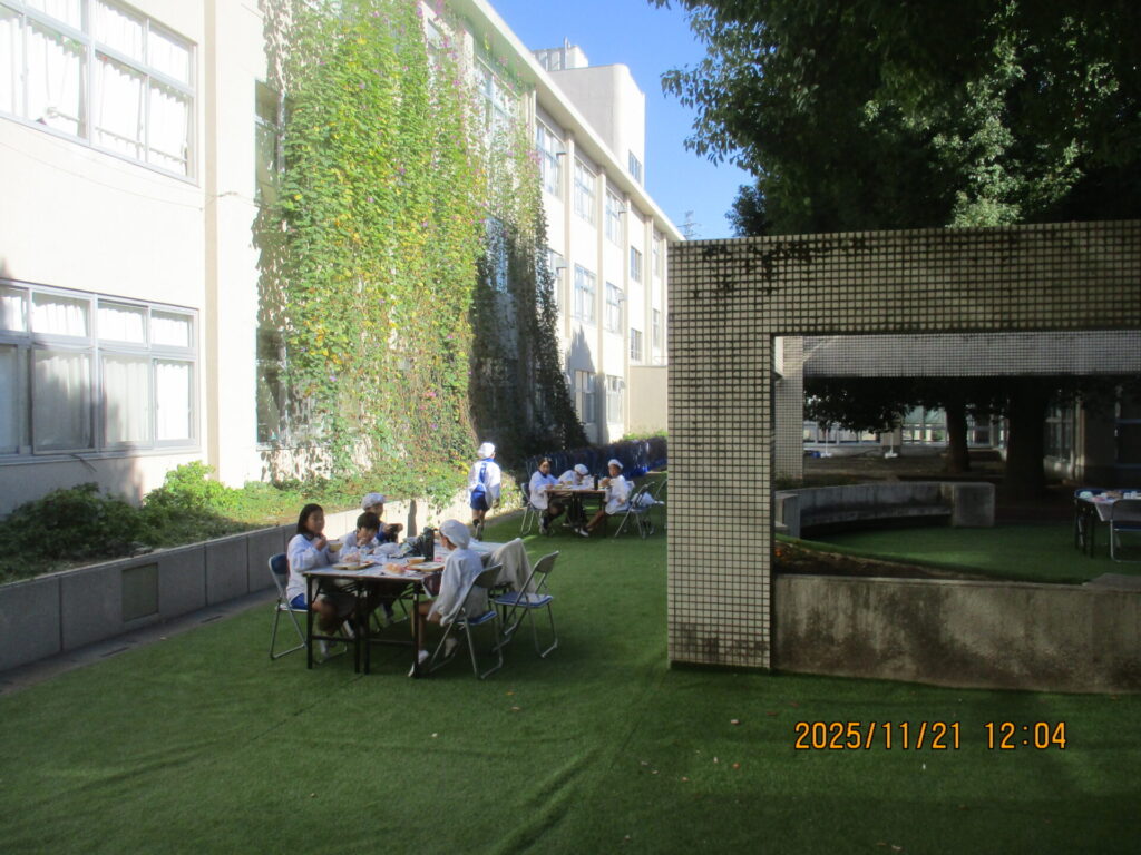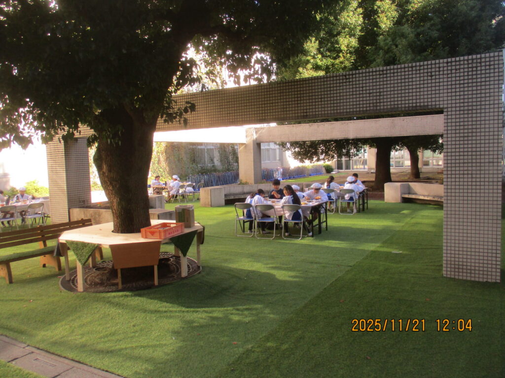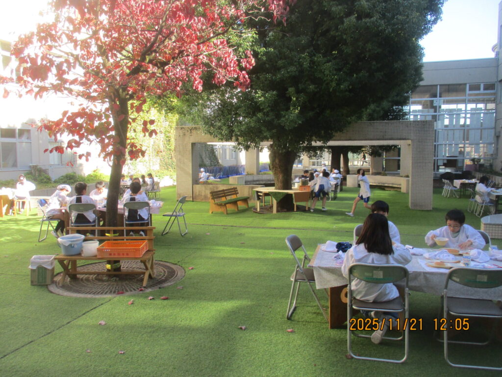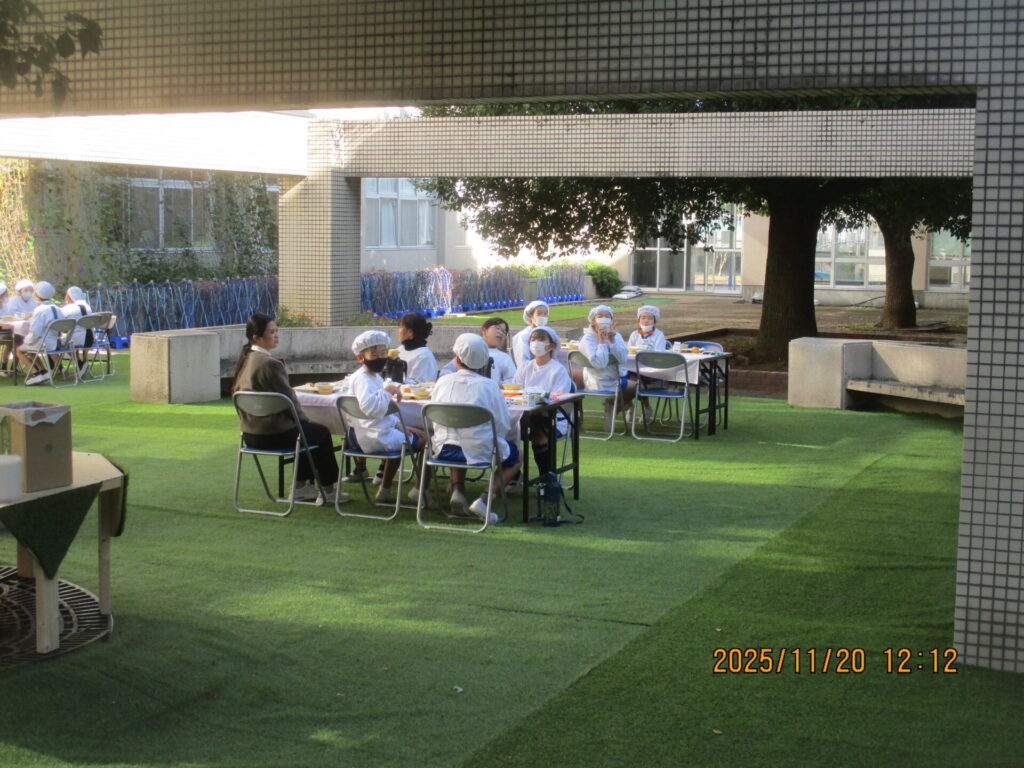 中庭で給食を食べる「わくわくガーデン給食」を実施しました。