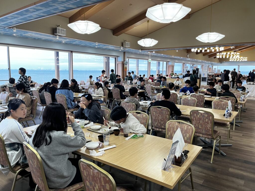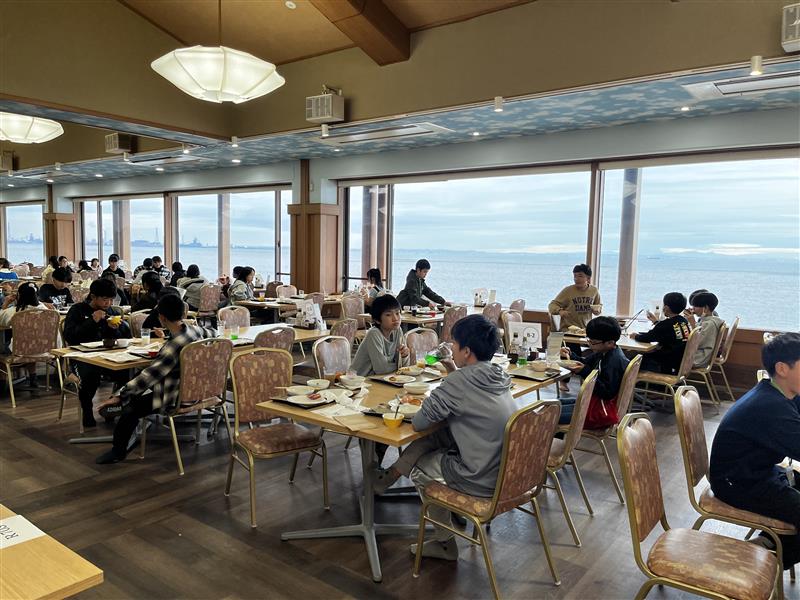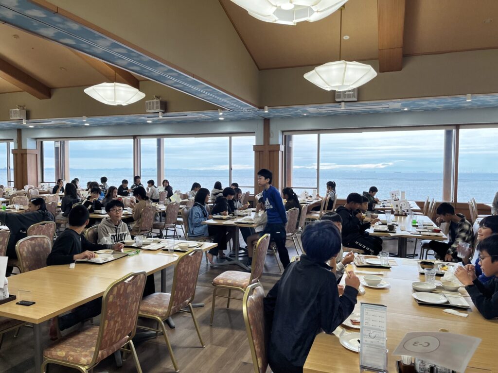 2日目を迎えました。寝不足もありそうですが、みんな元気です。海を眺めながらの朝食は格別です。